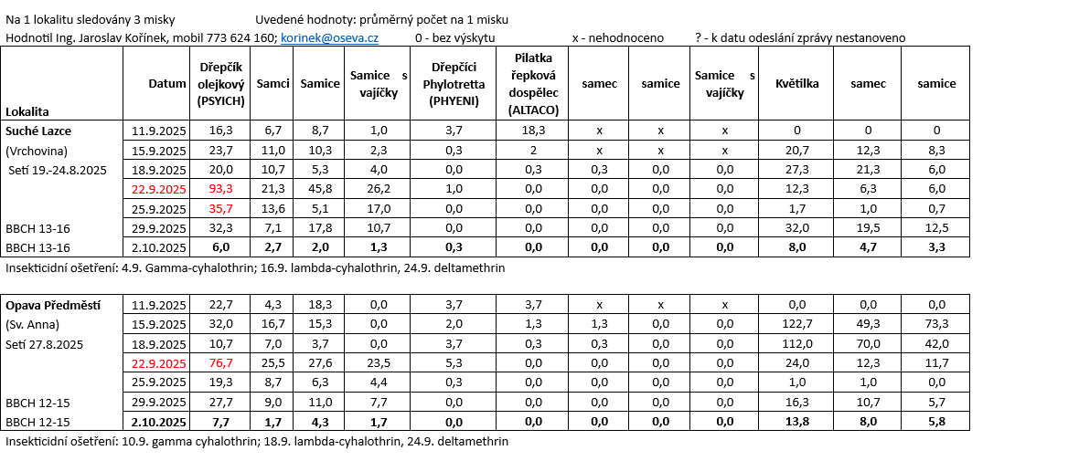 K 2.10.2025 byl na obou sledovaných lokalitách zaznamenán pokles záchytů dřepčíka olejkového srovnatelné Suché Lazce 6,0 a Opava Předměstí 7,7 jedinců na 1 misku.